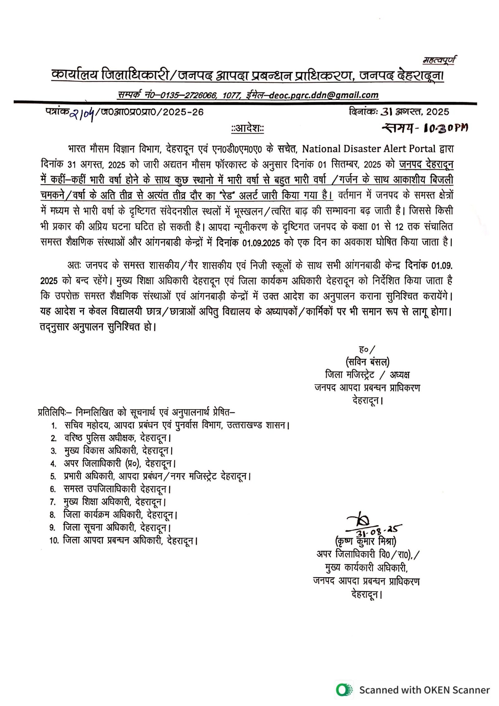उत्तराखंड में 01 सितम्बर को बारिश का अलर्ट, देहरादून समेत सभी 13 जिलों में स्कूल रहेंगे बंद