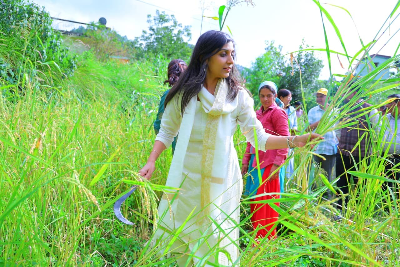 डीएम स्वाति एस. भदौरिया ने खुद काटी धान की फसल, डुंगरी गांव में क्रॉप कटिंग प्रयोग का निरीक्षण, किसानों से संवाद कर जाना हाल और दिए समाधान के निर्देश