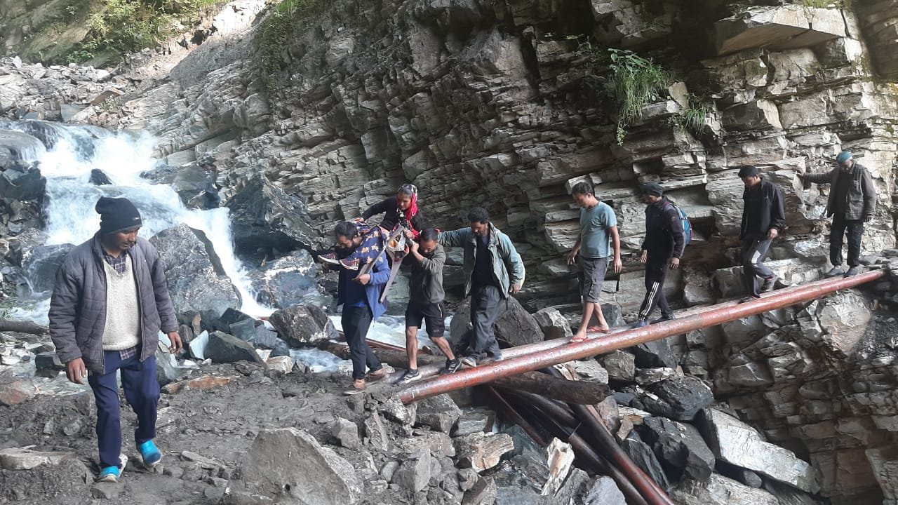 चमोली जनपद में भारी बारिश ने पूरे पहाड़ में मुसीबतें बढ़ा दी है। इस अवधि में गर्भवती महिला और बीमार व्यक्तियों को अस्पताल पहुंचाना एक चुनौती साबित हो रही है। चमोली जिले के लोहजंग – वाण सडक बुराकोट में क्षतिग्रस्त होने से वाण गांव के कर्जा तोक के ग्रामीणों ने गर्भवती किरन देवी पत्नी देवेन्द्र सिंह को एक किलोमीटर पैदल कुर्सी में बैठाकर जान जोखिम में डालते हुये उफनते गदेरे के ऊपर बल्लियों को पार करके गाडी तक पहुंचाया जहां से गर्भवती को देवाल प्राथमिक स्वास्थ्य केंद्र भेजा गया। सामाजिक कार्यकर्ता हीरा सिंह गढवाली ने कहा की लोहजंग वाण सडक बुराकोट में 100 मीटर बह जाने से वाण गांव के लोगो को परेशानी का सामना करना पड रहा है। बुधवार को प्रशासन द्वारा बुराकोट गदेरे में आवाजाही के लिए जो वैकल्पिक पुल बनाया था वही पुल आज गर्भवती किरन देवी के लिए वरदान साबित हुआ। । ग्रामीणों • बडी मुश्किल से किरन देवी को कुर्सी में बैठाकर झरने और गदेरे से पार कराया। उन्होने सरकार से मांग की है की अतिशीघ्र बुराकोट गदेरे में वैली ब्रिज बनाया जाय। आशा कार्यकत्री लक्ष्मी देबी, कुवर सिंह, नरेंद्र सिंह, उदय सिंह, मोहन सिंह, खजान सिंह, सुरेश सिंह, कुमारी राधा, कुन्दन सिंह व सामाजिक कार्यकर्ता हीरा सिंह गढ़वाली आदि लोगों ने गर्भवती को बुराकोट में सुरक्षित पार कराके गाडी तक पहुंचाया।