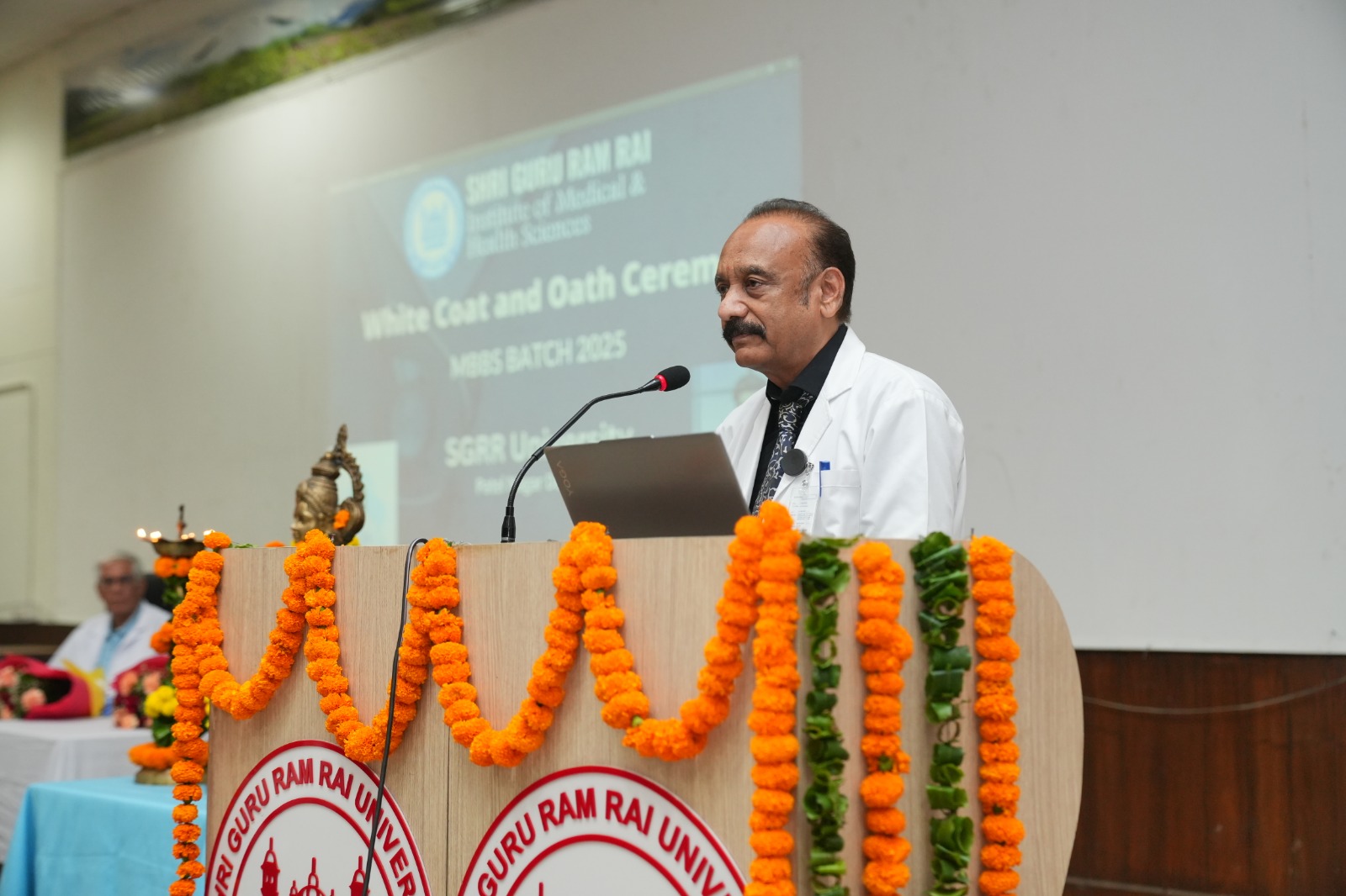 डॉ. अशोक नायक ने अपने संबोधन में सभी नव आगुंतक छात्र-छात्राओं का स्वागत करते हुए कहा कि श्री गुरु राम राय इस्टीट्यूट ऑफ मेडिकल एण्ड हैल्थ साइंसेज में मेडिकल की शिक्षा के साथ-साथ मानवता की सेवा करना भी सिखाया जाता है। इसके उपरांत अकेडमिक इन्चार्ज डॉ. निधि जैन द्वारा नव आगुंतक (फ्रैशर) छात्र-छात्राओं को चरक शपथ भी दिलवाई गई। इस अवसर पर छात्र-छात्राओं कोे सम्बोधित करते हुए डॉ. पुनीत ओहरी ने कहा कि वाईट कोट सैरेमनी नेशनल मेडिकल कमीशन (एनएमसी) द्वारा आवश्यक दिशा निर्देश है इसका पालन प्रतिवर्ष किया जाता है। उन्होने कहा कि यह शपथ ले कर मैडिकल छात्र-छात्राएं अपने जीवन की एक नये अध्याय की शुरूआत कर रहे है। उनके द्वारा चरक शपथ के माध्यम से मैडिकल छात्र-छात्राओं को मैडिकल प्रोफेशन के नैतिक,मौलिक व मानवीय उत्तरदायित्व को समझाया गया। उन्होने कहा कि आज चरक शपथ लेकर मैडिकल छात्र-छात्राओं ने अपने प्रोफेशन के माध्यम से मरीजो व समाज की पूरी ईमानदारी, मेहनत व लगन के साथ सेवा करने का संकल्प लिया है जिसे वे सदैव निभाएंगे ।
