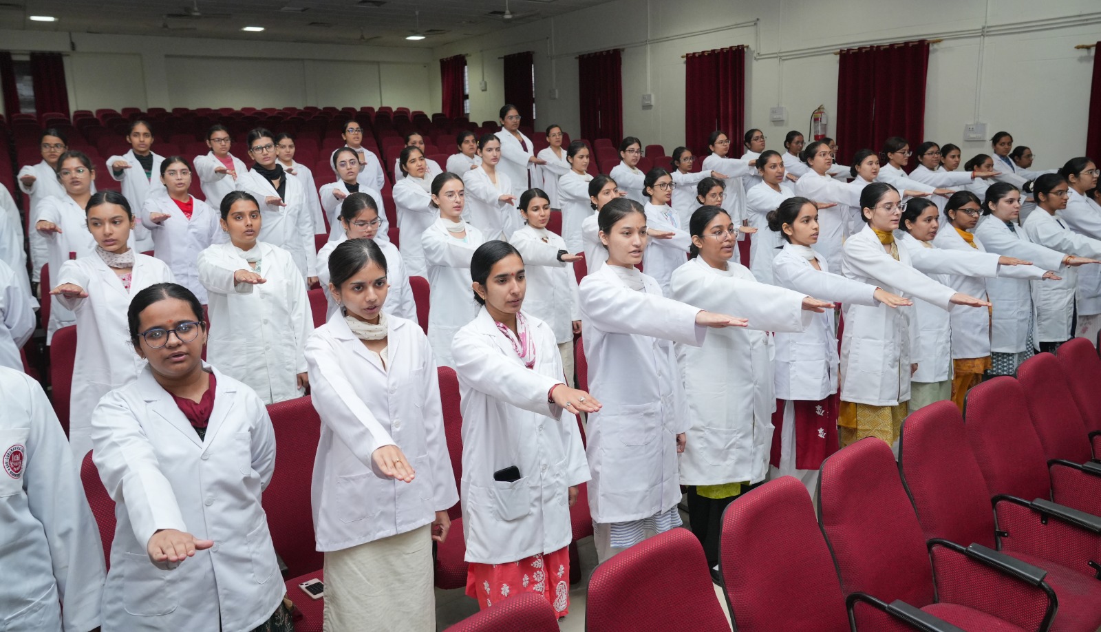 इस वाईट कोट सैरेमनी व चरक शपथ मे 134 नव आगुंतक (फ्रैशर) छात्र-छात्राओं ने बडे़ उत्साह के साथ प्रतिभाग किया। कार्यक्रम मे मंच संचालन डॉ. वाणी शर्मा द्वारा किया गया। इस अवसर पर डॉ. सुमन बाला, डॉ. ललित कुमार वाष्णेय, डॉ. तारिख मसूद व विभिन्न विभागो के विभागाध्यक्ष, फैक्लटी सदस्य व छात्र-छात्राओं के अभिभावकगण भी उपस्थित थे।